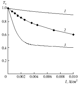 Рис. 4. Зависимости экспериментальных чисел переноса ионов Na+ от плотности протекающего тока, обобщенные по литературным данным: 1 (T+) – случай мембран с ионогенными группами с низкой каталитической активностью; 2 (T0) – случай мембран с каталитически активными ионогенными группами; 3 (T-) – случай мембран с каталитически высокоактивными ионогенными группами. 3. Задается начальная толщина диффузионного слоя (I) 4. С помощью итерационной процедуры находятся величины 5. По полученному распределению напряженности электрического поля находится падение потенциала во всей системе 6. Значения В диссертационной работе проведены расчеты для девяти случаев комбинации кривых T+, T0, T- (рис. 4), отражающих зависимость эффективных чисел переноса от плотности тока, с вольт-амперными кривыми U-, U0, U+, представленными на рис. 3. Найдена зависимость толщины диффузионного слоя от плотности тока (рис. 5), которая поддается прямой верификации с помощью измерения d(i) методом лазерной интерферометрии. Кроме этого параметра, с помощью модели получено распределение концентраций в диффузионном слое, распределениz напряженности электрического поля и плотности заряда.