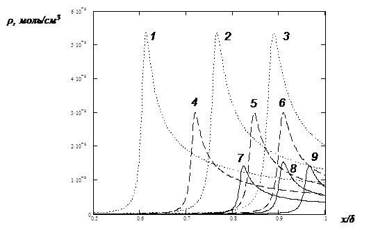 Рис. 6. Распределение плотности заряда в диффузионном слое (I) при токе 95,2 А/м2 (17,7·Iпр), рассчитанное для различных комбинаций зависимости эффективных чисел переноса от плотности тока и вольт-амперных кривых (рис. 3, 4): 1 – T+—U+; 2 – T+—U0; 3 – T+—U-; 4 – T0—U+; 5 – T0—U0; 6 – T0—U-; 7 – T-—U+; 8 – T-—U0; 9 – T-—U- При заданной форме кривой T(i) зависимость толщины диффузионного слоя от плотности тока полностью определяется расположением вольт-амперной кривой Ui относительно теоретической U*, рассчитанной по модели с постоянной толщиной диффузионного слоя. Этот вывод имеет в большей степени теоретическое значение, так как реально наблюдаемые на практике вольт-амперные кривые лежат, как правило, много выше теоретической кривой U*, поэтому в таких системах наблюдается уменьшение толщины диффузионного слоя, которое при токах значительно превышающих предельный может составлять величину более 80% от исходной толщины δ0 (рис. 5). Сравнение результатов расчета по предложенной модели и по модели с постоянной толщиной диффузионного слоя, рассмотренной в главе 4, позволяет сделать следующие выводы. В случае уменьшения толщины диффузионного слоя электроконвекция приводит к снижению (по сравнению с моделью, рассмотренной в главе 4) величины пространственного заряда, и толщина ОПЗ в мембране изменяется по закону Распределение концентраций в отдающем противоионы диффузионном слое носит такой же характер, как и в случае задачи по учету нарушения электронейтральности, т.е. зона делится на три части: квазиэлектронейтральную зону, электромиграционную зону и область двойного электрического слоя. Однако учет переноса продуктов диссоциации воды приводит к тому, что ОПЗ имеет меньшие размеры. Заряд в диффузионном слое компенсируется зарядом противоположного знака в мембране, однако их абсолютные величины имеют меньшее значение, чем в моделях с постоянной толщиной диффузионного слоя. В то же время концентрация противоионов на границе диффузионный слой (I)/мембрана уменьшается, проходя квазиравновесную стадию, и приблизительно со 100iпр наступает режим Шоттки. Это означает, что в электродиализных аппаратах режим Шоттки не достигается. Хотя этот вывод сделан в рамках данной модели, он согласуется с результатами экспериментов, выполненных с помощью метода лазерной интерферометрии (В.И. Васильева и В.А. Шапошник, ВГУ). В результате проведенных расчетов для различных значений константы относительной диэлектрической проницаемости мембраны Результаты расчета теоретической толщины диффузионного слоя по модели были сопоставлены с экспериментальными данными, полученными методом лазерной интерферометрии В.И. Васильевой и В.А. Шапошником. Получено качественное совпадение результатов для случая катионообменной мембраны. Как было показано в рамках модели, не учитывающей диссоциацию воды и сопряженную конвекцию, в диффузионном слое не достигается значение напряженности электрического поля для существенного ускорения реакции диссоциации воды. Распределение напряженности электрического поля, рассчитанное по модели с учетом диссоциации воды и сопряженной конвекции показывает, что такой механизм становится еще менее вероятным при учете влияния ионов Н+ и ОН- и сопряженной конвекции на величину ОПЗ и напряженности электрического поля. В то же время в мембране вблизи м