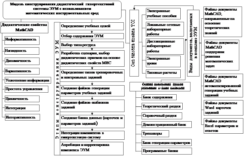 Рис. 1. Модель конструирования электронных учебных материалов средствами МИС Модель конструирования гипертекстовой системы ЭУМ имеет многокомпонентную структуру, включающую этапы конструирования, типы ресурсов системы ЭУМ, виды документов, входящих в её состав, а также типовые структурные единицы, из которых состоят сами документы. На этапе определения учебных целей мы отвечаем на вопросы о том, зачем создавать электронные учебные материалы, каких целей мы хотим достичь, действительно ли их можно достичь с использованием ЭУМ. На данном этапе перечисляются действия, демонстрирующие формируемые умения (знания); детализируются знания, умения, навыки, позволяющие выполнить это действие. Цели обучения являются инструментами, которые используются при отборе содержания, выборе дидактических приемов реализации, определении результативности разрабатываемых учебных материалов. В процессе отбора содержания гипертекстовой комплекса ЭУМ следует руководствоваться нормативными документами: государственными образовательными стандартами, учебными программами по дисциплине, списками литературы, приводимыми в них. Отбор содержания должен проводиться на основе принципов обучения. Состав отобранного учебного материала и связи между единицами материала (учебными элементами) наглядно могут быть представлены в виде структурно-логической схемы. В процессе разработки сценария ЭУМ формируется план конструирования и применения ЭУМ, определяется их тип (учебное пособие, локальная сетевая или дистанционная лабораторная работа, электронный урок, фрагмент урока, способ объединения в гипертекстовую систему ЭУМ), состав и внешний вид типовых структурных единиц (блока содержания, теоретических разделов, демонстрационных блоков, тренажеров и блоков генерации параметров, блоков обратной связи, типовых программных блоков), расположение их в файлах-документах программ MathCAD, Excel, Word. Результатом этапа разработки ЭУМ является законченный рабочий сценарий в виде словесного описания или блок-схемы. На этапе определения типов тренировочных и контрольных заданий выбирается форма заданий: вопросы, упражнения, задачи, различные виды тестов, поисково-исследовательские задания и др. На этапе создания файлов генерации параметров выполняется параметризация заданий и выписываются генерационные формулы. На их основе конструируется файл-генератор параметров для автоматизированного создания нужного количества однотипных заданий. В процессе пересчета документа-генератора происходит генерация параметров и запись в файл сохранения параметров. Далее формируется банк данных индивидуальных учебных заданий, который может включать карточки сгенерированных индивидуальных заданий в электронном (документы Word, MathCAD) или бумажном виде. Создание файлов-шаблонов заданий (карточек заданий) выполняется на основе файлов генерации параметров, в структуре которого представлены блоки условий заданий в параметрической форме и блоки параметров, а при пересчете происходит добавление параметров задания с учетом номера его варианта в файл сохранения параметров. На этапе интеграции компонентов в гипертекстовую систему ЭУМ связываются при помощи гиперссылок и объектных связей отдельные ЭУМ, файлы, реализующие учебные задачи освоения теоретических знаний, 