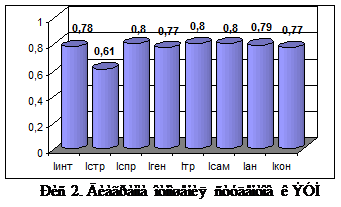 На основе технологии конструирования учебных заданий в среде МИС MathCAD был создан комплекс электронных учебных работ для дидактического обеспечения процесса обучения конструированию электронных учебных материалов. Апробация комплекса осуществлена в ходе эксперимента, которым были охвачены 143 студента. После выполнения лабораторных работ была предложена анкета, цель которой в оценивании студентами лабораторной работы в целом и отдельных ее компонент. По результатам ответов на вопросы анкеты вычислены индексы, показывающие качество разработанных учебных лабораторных работ, входящих в состав ПМК. Это индексы удовлетворенности интерфейсом лабораторной работы Iинт, оптимальности структуры лабораторной работы Iстр; индексы целесообразности включения: справочных теоретических материалов Iспр, генераторов заданий Iген, тренажеров Iтр, заданий для самопроверки Iсам, анимационных роликов Iан, контрольных заданий Iкон. Максимально возможное значение каждого индекса равно 1, полученные в результате анкетирования значения индексов отражены на рис. 2.