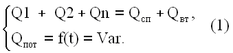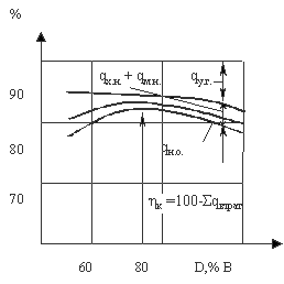 де Q1, Q2, Qn – кількість тепла, що віддають до системи котли відповідно 1-й, 2-й… n-й, Qвт- втрати теплоносія (витоки, винесення тепла до навколишнього середовища і т. ін.), Qсп– кількість тепла необхідного споживачу, яке є змінною величиною, та функцією часу. Отже необхідно, щоб топки працювали з такою потужністю, щоб кількості вироблюваного тепла вистачало для споживачів та на покриття витрат. При оптимальній роботі загальний ККД котлів має бути максимальним. А особливість роботи котлів міститься у тому, що ККД котла нелінійно залежить від його продуктивності, та максимальний ККД ми отримаємо при роботі котла десь на 70-80 % від його номінальної потужності, що наглядно демонструє рис.1 [1]. Отже при регулюванні роботи котельної установки необхідно отримати максимальний ККД при виконанні умови (1). Цільовою функцією у такому разі є: η общ→ Max, (2) де