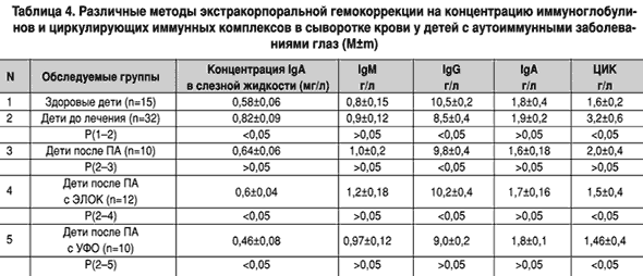 Методика проведения плазмофереза ПА проводили в специализированной операционной отделения клинической гематологии и иммунотерапии МОНИКИ им. М.Ф.Владимирского. Из используемых в клинической практике методов ПА нами избран дискретный, что обусловлено его простотой и доступностью. Объем эксфузируемой крови зависел от состояния гемодинамики и обычно не превышал 200 мл за 1 эксфузию. После центрифугирования плазму удаляли, а эритроцитарную массу реинфузировали. За один сеанс ПА осуществляли 2–3 эксфузии крови, из которых удаляли 400–500 мл плазмы. Курс ПА включал 4–5 сеансов. Плазмапотерю во время первых двух сеансов возмещали кристаллоидными и небелковыми коллоидными растворами (желатиноль, полиглюкин), в последующем – белковыми: альбумин, протеин, нативная плазма в соотношении 2:1 или 3:1. Метод плазмофереза с экстракорпоральным лазерным облучением крови Техника ЭЛОК заключается в том, что при проведении ПА реинфузируемая эритромасса облучалась гелий–неоновым лазером посредством световода, крепящегося на системе переливания крови и кровезаменителей, без нарушения ее целостности. В качестве источника когерентного излучения использовали гелий–неоновый лазер ЛГ–75 с максимальной мощностью излучения не менее 25 мВт/см2 , длиной волны 0,6328 мкм и с потоком мощности на конце световода от 5 до 15 мВт/см2 . Методика проведения плазмофереза с ультрафиолетовым облучением крови Методика проведения УФО крови заключалась в следующем: методом цитафереза у больного извлекали лимфоциты из 1 литра крови и подвергали их ультрафиолетовому воздействию на аппарате «ПРИЗ–2» в течение 30 мин. Мощность УФ–излучения составляла 2 Дж/см2 . Обработанную таким образом плазменную лейковзвесь реинфузировали затем больному. Показаниями к применению различных методов экстракорпоральной гемокоррекции у детей с аутоиммунными заболеваниями глаз служило тяжелое течение иммуновоспалительного процесса в глазу, неэффективность традиционной медикаментозной терапии, частые рецидивы заболевания. ПА проводился при менее тяжелых формах заболевания с минимальным количеством рецидивов. ПА в сочетании с квантовой гемотерапией проводили при длительном, затяжном характере процесса, с частыми рецидивами. ПА с ЭЛОК проводился детям при частоте рецидивов от 2–х до 3–х раз в год и с выраженными нарушениями региональной гидро–гемодинамики, обменных процессов в наружных слоях сетчатой оболочки. При длительном течении иммуновоспалительного процесса с нарушениями в иммунном статусе и с осложнениями заболевания мы применяли ПА с УФО лимфоцитов крови. Клиническая оценка эффективности экстракорпоральной гемокоррекции была основана на купировании воспалительного процесса в глазу, улучшении функциональных показателей, коррекции иммунитета и уменьшении или прекращении рецидивов. При проведении одного сеанса экстракорпоральной гемокоррекции отмечено уменьшение клинических показателей воспаления, но оно было нестабильным. Поэтому курсовое лечение составляло от 2–х до 4–х сеансов в зависимости от формы, стадии, тяжести процесса и иммунологических показателей. Результаты и обсуждение После проведения сеансов экстракорпоральной гемокоррекции у 2/3 детей отмечено купирование воспалительного процесса и у 1/3 – значительное его уменьшение. Cнижение ЦИК свидет