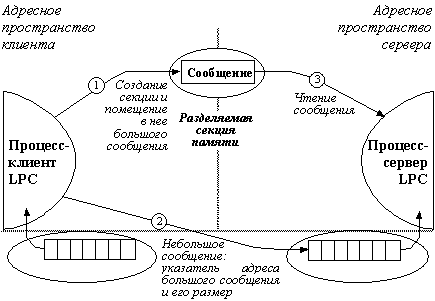 Клиентский стаб сам решает, какого размера сообщения понадобятся для передачи параметров процедуры Если потребуется сообщение 256 байт, то стаб создает секцию памяти и отображает ее (с помощью менеджера виртуальной памяти) в свое адресное пространство и пространство процесс-сервера |