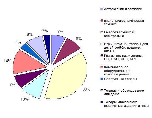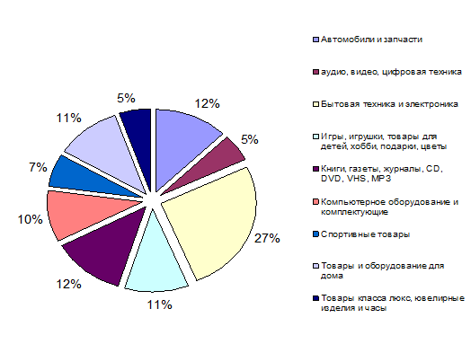 Рис 1.6. Структура В2С по товарным группам (по объемам продаж) Таблица 1.6 Основные товары, покупаемые через Интернет