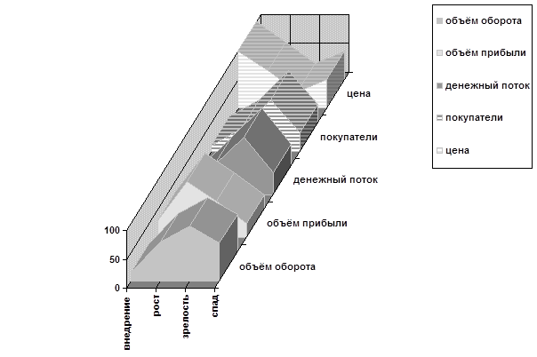 Из неё видно, что мы можем получить достаточно большое разнообразие мониторов, различающихся лишь по нескольким признакам. Т.е. благодаря этой таблице можно легко и наглядно показать то разнообразие мониторов, которые мы можем предложить покупателю. После определения товарного ассортимента определим наши действия на различных этапах жизненного цикла нашего товара. Фирма Panasonic начала производить мониторы уже достаточно давно. Но в мониторе Zen Tan применены новейшие технологии. Он был разработан только в конце 1996 года, а в продажу начал поступать только сейчас - в конце 1997 года. И если разделить жизненный цикл товара на · внедрение на рынок · рост · зрелость · спад то получится та картина, которую мы можем наблюдать на графике. Для того, чтобы улучшить первый этап следует увеличить количество рекламы, чтобы как можно большее число людей узнало о новинке за минимальный промежуток времени.
