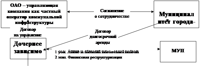 На взгляд автора, основные достоинства приведенной системы показателей состоят в универсальности и стандартизации, доступности и достоверности, комплексности и компактности. Локальная монополия при рассматривается как крупный хозяйствующий субъект, влияющий на развитие инфраструктуры города-курорта, определяющий конкурентоспособность рекреационной экономики и несущий в себе ряд социальных функций В третьей главе «Организационно-управленческие формы реализации механизма финансирования инвестиций в экономическую инфраструктуру рекреационной сферы» обосновано то, что главной концептуальной основой развития инфраструктуры должны стать те или иные формы частно-государственного финансирования при условии сохранения за государством права собственности на объекты инфраструктуры и передачи прав по владению и пользованию частным компаниям. Анализ инвестиционной привлекательности концессий в инфраструктурном секторе показал их преимущества по сравнению с другими формами использования частного капитала. При этом сделан вывод о том, что в условиях острой необходимости повышения экономической эффективности при непременном сохранении социальной направленности инфраструктурных предприятий, относящихся к государственной (муниципальной) и общественным формам собственности, локальные естественные монополии могут стать определяющим объектом концессионных отношений. Так анализ состояния отрасли коммунального хозяйства городов-курортов показал, что определяющее значение для инфраструктурных концессий, выступают источники финансирования инвестиций на концессионной основе: - собственные средства концессионера, займы коммерческих банков и международных финансовых институтов, целевые средства государства на покрытие затрат на строительство, приобретение земель для полосы отвода, покрытие стоимости готовых работ и т.п. В результате разработана модель взаимоотношений управляющей компании с муниципалитетами городов-курортов наиболее близкая к понятию концессии, которая обеспечит создание эффективной схемы развития коммунальной инфраструктуры рекреационного комплекса при переходе на принципы проектного управления долгосрочными инвестиционными программами (рис.5).1 Далее исследованы возможности использования рынка муниципальных займов для привлечения дополнительных ресурсов за счёт сбережений и накоплений коммерческих банков, нефинансовых структур, населения в форме инвестиций на модернизацию реконструкцию инфраструктурных объектов городов-курортов. При этом выявлено два определяющих фактора, сдерживающих развитие рынка муниципальных облигационных заимствований для финансирования хозяйственной инфраструктуры курортно-рекреационного комплекса: низкая доходность муниципальных бюджетов и их малые объемы; недостаточный уровень профессиональной управляемости муниципальных администраций.
