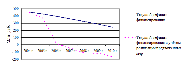 Составлен автором Рисунок 7 – Сокращение текущего дефицита финансирования сектора ВКХ городов-курортов Черноморского побережья Краснодарского края при реализации предложенного пакета мер С момента ликвидации текущего дефицита финансирования (т.е. примерно с 2007 года) реальны возможности реализации модернизации и развития ВКХ преимущественно за счет внутренних источников финансирования, и следовательно, начнётся осуществление программы массированных капвложений. На основе изложенного материала следует сделать следующие выводы и предложения: Учитывая возрастающую роль финансовой системы в мобилизации ресурсов для инвестиционных процессов, при разработке программ финансирования инвестиций в ИРК, необходимо активизировать частные корпоративные источники финансирования ИРК; 2) Одной из причин, препятствующих привлечению негосударственных инвестиций в ИРК является несовершенство методических подходов к комплексной оценке инвестиционной привлекательности объектов ИРК. С этой целью предложена методика, позволяющая не только количественно оценить влияние группы факторов на величину инвестиций, но и учесть интересы участников инвестиционного процесса. 3) Для сбалансированного развития предприятий экономической инфраструктуры и рекреационного комплекса необходимо создание финансово- инвестиционного механизма, способного аккумулировать (накапливать) временно свободные денежные фонды и в последующем трансформировать их в инвестиционные ресурсы; 4) Решение обозначенной научно-практической проблемы находится в плоскости создания единого инфраструктурно-рекреационного комплекса с многоуровневой системой финансово-инвестиционных отношений, способных выступить в качестве основы формирования ресурсной базы инвестиционного процесса; 5) Учитывая острую необходимость в повышении эффективности муниципально-частного взаимодействия при финансировании объектов ИРК, использование концессионных соглашений выступает действенной формой социально-экономического управления в процессе реализации инвестиционных проектов; 6) Исследование применения организационно-управленческих форм финансирования инвестиций в ИРК побудило предложить создание СФУ, призванного обеспечивать покрытие дефицита бюджетных средств за счет рынка ссудного капитала с элементами секьюритизации; 7) Разработанная модель финансовой стратегии развития ВКХ городов-курортов Черноморского побережья Краснодарского края даёт возможность: - сократить текущий дефицит финансирования, сбалансировать потребности в финансовых ресурсах с фактически имеющимися, а в перспективе накапливать свободные ресурсы для развития; - рассматривать результаты проведённых расчётов как основание для по-лучения финансирования из других источников – бюджетов различных уровней, международных финансовых организаций (МФО) или доноров; - обосновывать возможность и целесообразность увеличения уровня тарифов и повышения в них инвестиционной составляющей для обеспечения воспроизводственных процессов. Заключение диссертационной работы содержит теоретические и практические выводы, полученные в результате проведённого исследования. Основные положения диссертации опубликованы в работах: 1. Белухин В.В., Гогуа М.В. Инвестиции в инфраструктуру рекреацион- но