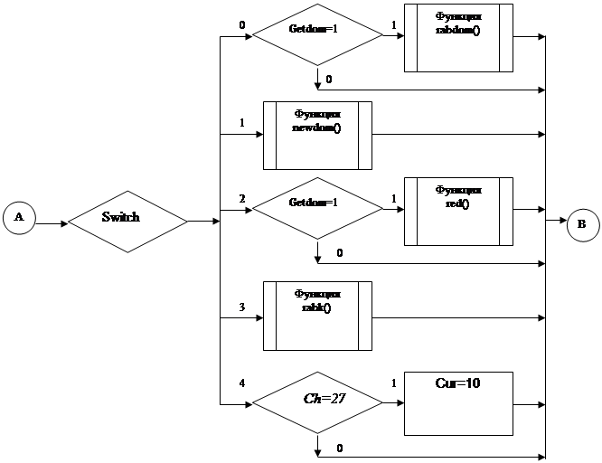 Рис. 17.Блок-схема функции menu()(продолжение). Таким образом, в результате выполнения данной работы можно отметить следующее: Любая даже малая работа по автоматизации рабочего места бухгалетра-кассира резко повышает эффективность деятельности и значительно экономит время на поиск, обработку и выдачу данных. При этом также выигрывается точность и качество обслуживания. Реализация программы на языке программирования С++ делает ее гибкой и удобной для дальнейшей переработки и трансформации при применении разработки в смежных областях. В работе рассмотрены основные положения об автоматизации рабочего места, представлена должностная инструкция бухгалтера-кассира предложены мероприятия по автоматизации рабочего места бухгалтера-кассира ЖЭУ. Список литературы 1С: Бухгалтерия (версия 7.5): руководство пользователя. – М.: Авис, 1998. – 215 с. Введение в конфигурирование в 1С: Бухгалтерии 7.7. - М.: Компьютерра, 1999. Галактика: руководство пользователя. - Новосибирск: Наука, 1999. Операции в программе 1С: Предприятие / Под ред. О.А. Абрамова. - М.: Информатика+, 1999. Дадько А.С. Бухгалтерский учет на компьютере. – М.: Амика-пресс, 1998. – 107 с. Умнова Э.А., Чистов Д.В. Бухучет на ПЭВМ. - М.: Аурум-Плюс, 1998. Харитонов С.А. Компьютерная бухгалтерия 7.7 в системе гибкой автоматизации бухучета. - М.: Прогресс, 1999. Чистов Д.В. Компьютерный учет валютных операций. - М.: Изд. дом 1С, 1999. Чистов Д.В. Основы компьютерной бухгалтерии. - М.: Информ-Пресс, 1998. Чистов Д. Программа 1С: Предприятие и ее базовые модули. - М.: Информ-пресс, 1999. Чистов Д. Хозяйственные операции в программе 1С: Предприятие. - М.: Информ-Пресс, 1999. Шуремов Е.Л. Компьютерный учет торговых операций. - М.: изд. дом 1С, 1999. |