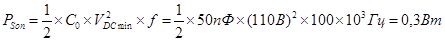 Потери на силовом транзисторе Из таблицы характеристик транзистора имеем: C0=50пФ – выходная емкость сток-исток транзистора; RDSon=1,6Ом (150 С0) – выходное сопротивление сток-исток транзистора. Расчет проведем при входном напряжении VDCmin=110В; Найдем потери при включении транзистора: