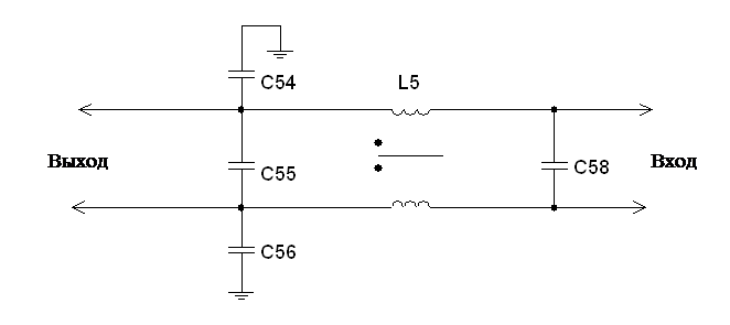 Рис. 1.5.13. Входной фильтр электромагнитных помех. L5=L=450 мкГн С55=С58=Сх=0,22 мкФ С54=С56=Су=3,3 нФ