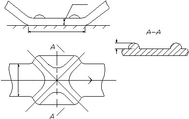4.4. Расчет оптимальной рабочей длины балки в зависимости от толщины полиимида и толщины фольги. 4.5. Технологические рекомендации по выполнению сварных узлов бескорпусных БИС. Прочностные характеристики и уровень надежности сварных и паянных соединений зависят в большей степени от правильного выбора сварного или паянного соединения, уровня и характера деформирования зоны сварки, сочетания соединяемых материалов. При сварке плоских выводов на контактные площадки кристаллов БИС прочность соединения зависит от характера деформации. Наиболее высокой прочностью обладает сварное соединение с ребрами жесткости. Такой вид наиболее оптимален при ограниченной ширине вывода. Вид сварной точки с оптимальным соотношением размеров, выполненной ультразвуковой сваркой, показан на рис.11.