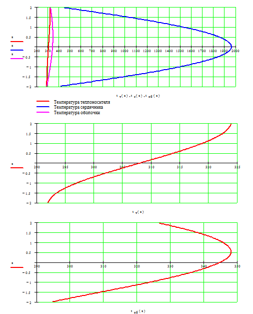 Прочерк в таблице означает, что максимальное или (и) минимальное значение величины находится за границами рассматриваемой области. Знак "* " означает, что ни одно значение не входит в накладываемые ограничения. Анализ таблицы показывает, что при заданных начальных условиях не существует значений m и qv ,которые удовлетворяли бы наложенным ограничениям. 3.5. Расчёт распределения температуры теплоносителя, оболочки и топливного сердечника по высоте активной зоны реактора. m = 1.4, qv = 125 кВт/л.