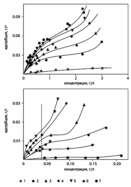Рис. 6. Изотермы сорбции йода (а) и родамина С (б) из их водных растворов образцами полиэтилентерефталата, растянутыми в н-пропаноле до различных степеней вытяжки: 1 - 20%, 2 - 50%, 3 - 100%, 4 - 150%, 5 - 200%, 6 - 300%, 7 - 400%. На рис.6 представлены изотермы адсорбции двух веществ - йода (а) и родамина С (б) - из их водных растворов. Хорошо видно, что полимер, растянутый в жидкости, действительно становится эффективным адсорбентом, способным поглощать любые низкомолекулярные вещества из их растворов. Причем эффективность адсорбции зависит как от величины деформации полимера, так и от молекулярных размеров сорбируемого вещества (молекулы йода имеют размер ~0.5 нм, а молекулы родамина С - 17.5 нм), рис.7. Из рисунка хорошо видно, что адсорбция йода при малых степенях удлинения возрастает, а затем, достигнув максимума, перестает изменяться, в то время как более объемные молекулы родамина С в области 200%-го удлинения демонстрируют резкий спад адсорбции. Очевидно, крейзы, возникающие на первых этапах растяжения, содержат пустоты больших размеров, легко доступные даже крупным молекулам родамина С. По мере вытяжки крейзы разрастаются, что увеличивает площадь межфазной поверхности полимера, и, соответственно, возрастает адсорбция. Но когда начинается описанный выше структурный переход, приводящий к сжатию структуры и уменьшению эффективного диаметра пор, сокращается число пустот, доступных молекулам сначала родамина С (начиная со 250%-го удлинения), а затем и йода (с 300%-го). Таким образом, существует метод разделения молекул путем адсорбции из раствора тех из них, которые способны проникать в поры данного размера (молекулярно-ситовый эффект). Поскольку размер пор можно легко регулировать, изменяя степень вытяжки полимера в адсорбционно-активной среде (используя эффект Ребиндера), легко добиться избирательной адсорбции.