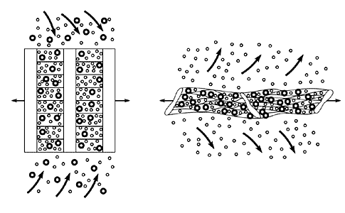 Рис. 8. Схема структурных перестроек, сопровождающих крейзинг полимера в двухкомпонентной жидкости, составляющие которой имеют разный молекулярный вес. Стрелками указано направление массопереноса жидкости на различных этапах (а, б) растяжения полимера. Чем сильнее мы вытягиваем полимер, тем больше красителя оказывается в порах. По достижении той степени вытяжки, когда начинается коллапс фибриллизованного материала крейзов и переход от рыхлой структуры к компактной, пойдет обратный процесс - растворитель станет выдавливаться из объема крейзов в окружающее пространство через микропоры (рис.8,б). Расстояния между фибриллами из-за их слипания в процессе вытяжки непрерывно уменьшаются и в конце концов оказываются соизмеримыми с размерами молекул красителя. В итоге происходит своеобразная ультрафильтрация раствора красителя на молекулярном уровне, в результате которой молекулы красителя захватываются в объеме полимера по чисто геометрическим (стерическим) причинам, а в окружающее пространство отфильтровывается в основном чистый растворитель. Ситуация полностью аналогична ловле рыбы сетью с ячейками определенного размера: мелкая рыба свободно проходит через такую сеть, а крупная не может этого сделать и остается в ней. По сути дела, эффект Ребиндера позволяет простейшим путем внедрять и фиксировать в структуре полимера практически любые нужные добавки. "Пустотный" транспорт Введение разнообразных низкомолекулярных добавок в полимеры - важнейшая технологическая задача, поскольку в практике чистые, не содержащие различных целевых примесей полимеры практически не используются. Но ввести в полимер добавку весьма непросто. Проиллюстрируем это на примере такого хорошо разработанного процесса, как крашение текстильных волокон. Как известно [6], при крашении краситель самопроизвольно переходит из раствора в волокно до установления равновесия, а скорость процесса и количество красящего вещества, поглощаемого волокном, определяются законами активированной диффузии и сорбции. Таким образом, чтобы ввести в полимер низкомолекулярное вещество, необходимо обеспечить, по крайней мере, два условия. Во-первых, должен быть какой-то путь для диффузии красителя в объем полимера, и, во-вторых, у полимера и красителя должны иметься активные функциональные группы, способные взаимодействовать друг с другом. Сорбция и диффузия - процессы довольно медленные, в связи с чем сформованное волокно окрашивают в специальных чанах при повышенной температуре. Активные функциональные группы нужны, чтобы удержать введенную добавку в структуре волокна. В противном случае краситель будет выделяться из текстильного изделия при стирках (линять). Если же необходимо ввести какую-либо добавку в гидрофобное волокно (полиэфир, полиолефин, поливинилхлорид), не содержащее активных функциональных групп, приходится использовать достаточно сложные и трудоемкие процедуры. Например, такую: волокно сначала пропитывают слегка загущенной дисперсной суспензией красителя, сушат, а затем прогревают при 200-210°С (термозоль-процесс) или подвергают воздействию паров трихлорэтилена (вапокол-процесс) [6]. Очевидно, что при этом краситель включается в основном в поверхностный слой волокна, в то время как его сердцевина остается неокрашенной. Наши исследования позво