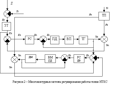 В системе имеется задатчик производительности котлаQ, который фактически является задатчиком температуры кипящего слоя (ЗТ), на который поступает сигнал уставкиZот МПП, выбранный в зависимости от необходимой производительности котла Q, с сигналом обратной связи по фактической производительности котла Qк.о. При этом необходимо заметить, что, так как производительность котла напрямую связана с температурой НТКС, то и ее фактическое значение определяется на основании текущего значения температуры слоя – Тс. Таким образом, на ЗТ поступает разностный сигнал Хз1 = Z – Тс. Это дает возможность корректировать значение уставки температуры НТКС в том случае, когда по определенным причинам мы не можем выйти на требуемый уровень производительности Q при заданном значении Тс. С задатчика температуры сигнал Хз2 поступает на регулятор скорости дутьевого воздуха (РСДВ) и регулятор скорости забрасывания твердого топлива в топку НТКС (РС) . После этого управляющий сигнал Хз7 с РС поступает на исполнительный механизм поворота лопаток вентилятора дутьевого воздуха, что приводит к изменению скорости дутьевого воздуха. А это в свою очередь вызывает изменение температуры НТКС. В свою очередь управляющий сигнал Хз4 с регулятора скорости забрасывания твердого топлива поступает на приводной двигатель (ПД) забрасывателя топлива, который вращает вал питателя (ВП) твердого топлива. Для повышения качества управления вводим обратную связь по скорости вращения вала питателя, что достигается измерением скорости вращения вала и подачей сигнала с него Ув1 на сумматор, где он суммируется с Хз4 и в результате на ПД поступает уже суммирующий управляющий сигнал Хз5 . Аналогичным образом осуществляем коррекцию по скорости дутьевого воздуха, где сигнал Ув3 с датчика скорости дутьевого воздуха суммируется с сигналом РСДВ. Так как вначале приоритет регулирования температуры отдается регулированию изменением подачи твердого топлива, и лишь в случае невозможности получить необходимую глубину регулирования таким образом, переходим к регулированию дутьевым воздухом, то на РСДВ поступает также сигнал с ТГ, который суммируется с Хз2 . Для обоих контуров регулирования вводим обратную связь по температуре НТКС. Данный параметр измеряется с помощью ТП, на которую влияет температура НТКС Тс. В контуре регулирования по твердому топливу выходной сигнал с нее Fв суммируется с Ув1 , и их суммарный сигнал Ув2 через обратную связь поступает на сумматор, где суммируется с управляющим сигналом с ЗТ Хз2 и на РС уже действует сигнал Хз3 . В контуре регулирования по скорости дутьевого воздуха выходной сигнал с ТП Fв суммируется с сигналом с ДШДП Ув3 , и через обратную связь их суммарный Ув4 поступает на сумматор, где суммируется с управляющим сигналом с ЗТХз2и сигналом с ТГ и на РСДВ действует сигнал Хз6 . Таким образом, синтезированная схема позволяет регулировать работу топки НТКС в соответствии с задачей рациональной работы котельной [3], т.е. так, что нерациональный расход топлива и потери тепла сводятся к минимуму. Ввод контура регулирования по температуре позволяет выйти на требуемую мощность топки, так как температуры НТКС рассчитываются МПП исходя из условия наибольшего общего КПД при условии выполнения необходимой производительности Qc. Также необходимо подчеркнуть, чт