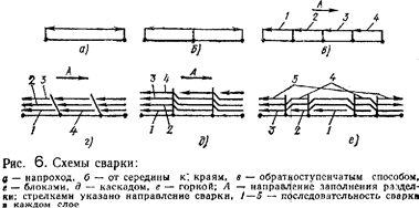 В зависимости от протяженности шва, материала, требований к точности и качеству сварных соединений сварка таких швов может выполняться различно рис 6: Короткие швы выполняют на проход - от начала шва до его конца. Швы средней длины варят от середины к концам или обратно ступенчатым методом. Швы большой длины выполняют двумя способами: от середины к краям (обратноступенчатым способом) и вразброс. При обратноступенчатом методе весь шов разбивается на небольшие участки длиной по150-200 мм, на каждом участке сварку ведут в направлении, обратном общему направлению сварки. Длина участков обычно равна от 100 до 350 мм. В зависимости от количества проходов (слоёв), необходимых для выполнения проектного сечения шва, различают однопроходный (однослойный) и многопроходный (многослойный) швы (рис.30). С точки зрения производительности наиболее целесообразными являются однопроходные швы, которые обычно применяются при сварке металла небольших толщин (до 8-10 мм.) с предварительной разделкой кромок. Сварку соединений ответственных конструкций большой толщины (свыше 20-25 мм.), когда появляются объёмные напряжения и возрастает опасность образования трещин, выполняют с применением специальных приёмов заполнения швов “горкой” или “каскадным” методом. При сварке “горкой” сначала в разделку кромок наплавляют первый слой небольшой длины 200-300 мм, затем второй слой, перекрывающий первый и имеющий в 2 раза большую длину. Третий слой перекрывает второй и длиннее его на 200-300 мм. Так наплавляют слои до тех пор, пока на небольшом участке над первым слоем разделка не будет заполнена. Затем от этой “горки” сварку ведут в разные стороны короткими швами тем же способом. Таким образом, зона сварки всё время находится в горячем состоянии, что позволяет предупредить появление трещин. “Каскадный” метод является разновидностью горки. Соединения под сварку собирают в приспособлениях, чаще всего с прихватками. Сечение прихваточного шва составляет примерно 1/3 от сечения основного шва, длина его 30-50 мм. Угловые швы сваривают “в угол” или “в лодочку”(рис.7).