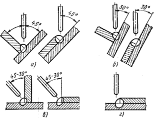 Рис. 7. Положение электрода и изделия при выполнении угловых швов: а – сварка в симметричную “лодочку”, б – в несимметричную “лодочку”, в – “в угол” наклонным электродом, г - с оплавлением кромок. При сварке “в угол” проще сборка, допускается большой зазор между свариваемыми деталями (до 3 мм), но сложнее техника сварки, возможны дефекты типа подрезов и наплывов, меньше производительность, так как приходится за один проход сваривать швы небольшого сечения (катет <8 мм) и применять многослойную сварку. Сварка “в лодочку более производительна, допускает большие катеты шва за один проход, но требует более тщательной сборки. Обеспечение нормативных требований по технологии и технике сварки - основное условие получения качественных сварных швов. Отклонения размеров и формы сварного шва от проектных чаще всего наблюдаются в угловых швах и связаны с нарушением режимов сварки, неправильной подготовкой кромок под сварку, неравномерной скоростью сварки, а также с несвоевременным контрольным обмером шва. Непроваром называют местное отсутствие сплавления между свариваемыми элементами, между металлом шва и основным металлом или отдельными слоями шва при многослойной сварке. Непровар уменьшает сечение шва и вызывает концентрацию напряжений, поэтому может значительно снизить прочность конструкции. Участки шва, где выявлены непровары, величина которых превосходит допустимую, подлежат удалению и последующей заварке. Непровар в корне шва в основном вызывается недостаточной силой тока или повышенной скоростью сварки, непровар кромки (несплавление кромки)- смещением электрода с оси стыка, а также блужданием дуги, непровар между слоями - плохой очисткой предыдущих слоёв, большим объёмом наплавляемого металла, натеканием расплавленного металла перед дугой. Подрезом называют местное уменьшение толщины основного металла у границы шва. Подрез приводит к уменьшению сечения металла и резкой концентрации напряжений в тех случаях, когда он расположен перпендикулярно действующим рабочим напряжениям. Наплывом называют натекание металла шва поверхность основного металла без сплавления с ним. Прожогом называют полость в шве, образовавшуюся в результате вытекания сварочной ванны, является недопустимым дефектом сварного соединения. Кратером называют незаваренное углубление, образующееся после обрыва дуги в конце шва. В кратере, как правило, образуются усадочные рыхлости, часто переходящие в трещины. Ожогами называют небольшие участки подвергшегося расплавлению металла на основном металле вне сварного шва. Подрезы, натёки, наплывы, прожоги, незаваренные кратеры, оставшиеся после сварки шлак и брызги, оплавление кромок (в угловых швах) вызываются преимущественно чрезмерной силой тока и напряжения на дуге, большим диаметром электродов, неправильными манипуляциями электродом, плохой сборкой под сварку низкой квалификацией или небрежностью сварщика. Технология газовой сварки Сущность газовой сварки . При газопламенной обработке металлов в качестве источника теплоты используется газовое пламя – пламя горючего газа, сжигаемого для этой цели в кислороде в специальных горелках. В качестве горючих газов используют ацетилен, водород, природные газы, нефтяной газ, пары бензина, керосина и др. Наиболее высокую температуру по сравнению