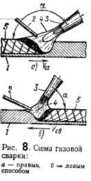 При нагреве газовым пламенем 4 кромки свариваемых заготовок 1 расплавляются вместе с присадочным металлом 2,который может дополнительно вводиться в пламя горелки 3. После затвердевания жидкого металла образуется сварной шов 5. К преимуществам газовой сварки относятся: простота способа, несложность оборудования, отсутствие источника электрической энергии. К недостаткам газовой сварки относятся: меньшая производительность, сложность механизации, большая зона нагрева и более низкие механические свойства сварных соединений, чем при дуговой сварке. Газовую сварку используют при изготовлении и ремонте изделий из тонколистовой стали толщиной 1-3 мм, сварке чугуна, алюминия, меди, латуни, наплавке твёрдых сплавов, исправлении дефектов литья и др. Техника сварки. В практике применяют два способа сварки - правый и левый (см. рис.8) При правом способе сварку ведут слева на право, сварочное пламя направляют на сваренный участок шва, а присадочную проволоку перемещают вслед за горелкой. Так как при правом способе пламя направлено на сваренный шов, то обеспечивается лучшая защита сварочной ванны от кислорода и азота воздуха, большая глубина плавления, замедленное охлаждение металла шва в процессе кристаллизации. Теплота пламени рассеивается меньше, чем при левом способе, поэтому угол разделки кромок делается не 90 °, а 60-70°, что уменьшает количество наплавленного металла и коробление. При правом способе производительность на 20-25 %выше, а расход газов на 15-20 % меньше, чем при левом. Правый способ целесообразно применять при сварке металла толщиной боле 5 мм и металлов с большой теплопроводностью. При левом способе сварку ведут справа налево, сварочное пламя направляют на ещё не сваренные кромки металла, а присадочную проволоку перемещают впереди пламени. При левом способе сварщик хорошо видит свариваемый металл, поэтому внешний вид шва лучше, чем при правом способе; предварительный подогрев кромок свариваемого металла обеспечивает хорошее перемешивание сварочной ванны. Благодаря этим свойствам левый способ наиболее распространён и применяется для сварки тонколистовых материалов и легкоплавких металлов. Мощность сварочной горелки при правом способе выбирают из расчёта 120-150 дм^3/ч ацетилена, а при левом -100-130 дм^3/ч на 1 мм толщина свариваемого металла. Диаметр присадочной проволоки выбирают в зависимости от толщины свариваемого металла и способа сварки. При правом способе сварки диаметр присадочной проволоки d=S2 мм., но не более 6 мм, при левом d=S2+1 мм, где S- толщина свариваемого металла, мм Скорость нагрева регулируют изменением угла наклона aмундштука к поверхности свариваемого металла(рис. 9, а).