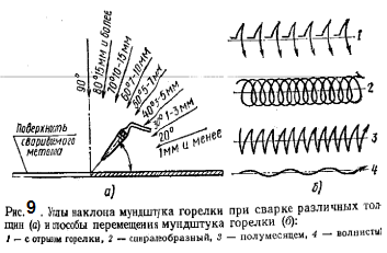 Чем толще металл и больше его теплопроводность, тем больше угол наклона мундштука к поверхности свариваемого металла. В процессе сварки газосварщик концом мундштука горелки совершает одновременно два движения: поперечное (перпендикулярно оси шва) и продольное (вдоль оси шва) (рис. 9) Основным является продольное движение. Поперечное движение служит для равномерного прогрева кромок основного металла и получения шва необходимой ширины. Газовой сваркой можно выполнять нижние, горизонтальные (на вертикальной плоскости), вертикальные и потолочные швы. Горизонтальные и потолочные швы обычно выполняют правым способом сварки, вертикальные снизу вверх - левым способом.