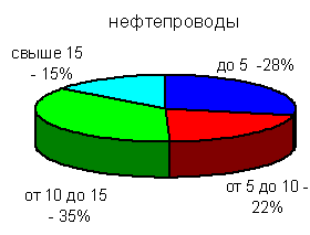 Рис. 9 - Протяженность трубопроводов, защищаемых ингибиторами коррозии Анализ рис. 7 и 9 свидетельствует о том, что ингибиторная защита трубопроводов Южно-Ягунского месторождения в целом не достигает цели: несмотря на имевшее место увеличение протяженности защищенных трубопроводов, их аварийность также возрастала. По-видимому, причина кроется в некоторых особенностях коррозии металла трубопроводов, характерных для данного месторождения. На Ватьеганском месторождении ингибиторную защиту трубопроводов начали применять с 2001 г. Протяженность защищаемых участков составляет 22,9 км при годовом объеме закачки 322,8472 т. В связи с малой продолжительностью эксплуатации трубопроводов (около одного года) невозможно по их удельной аварийности (рис. 6) оценить эффективность применяемого ингибитора на многолетнем временном интервале. В 2001 г. наблюдалось резкое снижение удельной аварийности низконапорных водоводов (рис. 6), что не могло быть вызвано только применением ингибитора ХПК-002. К другой причине этого явления относится, скорее всего, ослабление влияния факторов, воздействующих на скорость коррозии металла. К таким факторам относятся обводненность продукции, наличие в ней механических примесей, расслоение при определенных гидродинамических режимах течения водонефтяных эмульсий. Рассмотрим состояние промысловых трубопроводов Вятской площади Арланского месторождения, среди которых имеется 762,912 км трубопроводов различного назначения и диаметра (табл. 5). В том числе, сборные нефтепроводы и выкидные линии - 375,920 км; водоводы сточных вод высокого давления - 328,966 км; водоводы сточных вод низкого давления - 43,596 км; водоводы пресной воды - 14,43 км. Трубопроводы систем нефтесбора и ППД имеют диаметр от 89 до 630 мм и толщину стенки от 5 до 12 мм. Основным материалом труб является сталь 10 и 20. Свыше 40 % всех трубопроводов находится в эксплуатации более 15 лет, а 30 % - более 10 лет (рис. 10). По трубопроводам системы нефтесбора перекачивается скважинная продукция трех объектов разработки: каширо-подольского, визейского (терригенная толща нижнего карбона - ТТНК) и турнейского. Превалирует добыча нефти и жидкости из ТТНК (более 90 %), в связи, с чем данный объект разработки является основным. Таблица 5 Протяженность трубопроводов различного диаметра
