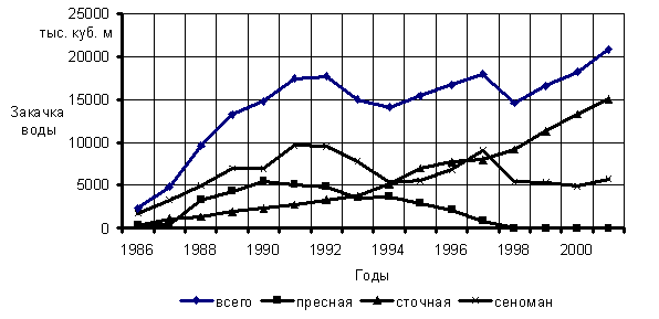 Рис. 4 - Изменение объема закачки воды по годам С 1991 по 2001 г.г. на Ватьеганском и Южно-Ягунском месторождениях произошло 455 порывов нефтепроводов, а с 1997 по 2001 г.г. - 71 порыв водоводов. В период с 1997 по 2000 г.г. отмечено резкое увеличение числа порывов как на нефтепроводах, так и на водоводах. В 2001 г. в динамике аварийности наблюдался незначительный спад (рис. 5). Аналогичная закономерность прослеживается и для удельной аварийности трубопроводов (рис. 6, 7). Высокая удельная аварийность нефтесборных трубопроводов и низконапорных водоводов по причине коррозии связана с малыми скоростями течения перекачиваемых сред, так как в этих условиях происходит расслоение водонефтяных эмульсий с образованием водного подслоя (в случае системы нефтесбора) и выносом механических примесей с их последующим осаждением на стенках труб. Имеет место усиление коррозии за счет возникновения и функционирования макрогальванопар "металл трубы - отложения".