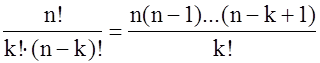 Сочетаниями называют операции над множеством из n различных объектов, в процессе которых образуют подмножества из k элементов, взятых из исходного множества, так, чтобы варианты подмножеств отличались друг от друга хотя бы одним элементом. Опустим доказательство формулы для расчета числа сочетаний из n по k в общем виде и приведем лишь примеры для числа сочетаний из 3 по 2 и из 5 по 3. · Элементы исходного множества A, B, C. Варианты подмножеств: AB, AC, BC – всего три. · Элементы исходного множества A, B, C, D, E. Варианты подмножеств: ABC, ABD, ABE, ACD, ACE, ADE, BCD, BCE, BDE, CDE – всего десять. В общем случае число вариантов сочетаний или просто – число сочетаний из n по k определяется по формуле