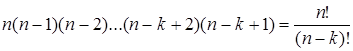 Пусть имеется множество, состоящее из n элементов. Обозначим его Примеры перестановок: 1)распределение n различных должностей среди n человек; 2)расположение n различных предметов в одном ряду. Сколько различных перестановок можно образовать во множестве Чтобы вывести формулу числа перестановок, представим себе n ячеек, пронумерованных числами Pn = n(n – 1)(n – 2)...×3×2×1 Число n(n – 1)(n – 2)...×3×2×1, то есть произведение всех натуральных чисел от 1 до n, называется "n-факториал" и обозначается n! Отсюда Pn =n! По определению считается: 1!=1; 0!=1. Пример. Сколько существует вариантов замещения 5-ти различных вакантных должностей 5-ю кандидатами?