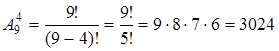 Отсюда получаем: Пример. Сколько существует различных вариантов выбора 4-х кандидатур из 9-ти специалистов для поездки в 4 различных страны?