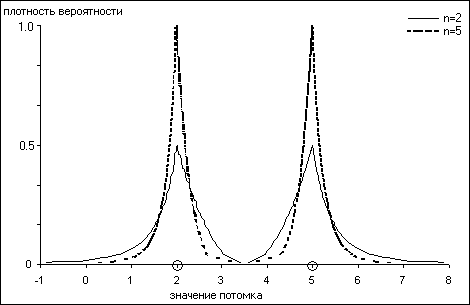 В формуле На рисунке приведена геометрическая интерпретация работы SBX кроссовера при скрещивании двух хромосом, соответствующих вещественным числам 2 и 5. Видно, как параметр n влияет на конечный результат: увеличение n влечет за собой увеличение вероятности появления потомка в окрестности родителя и наоборот.