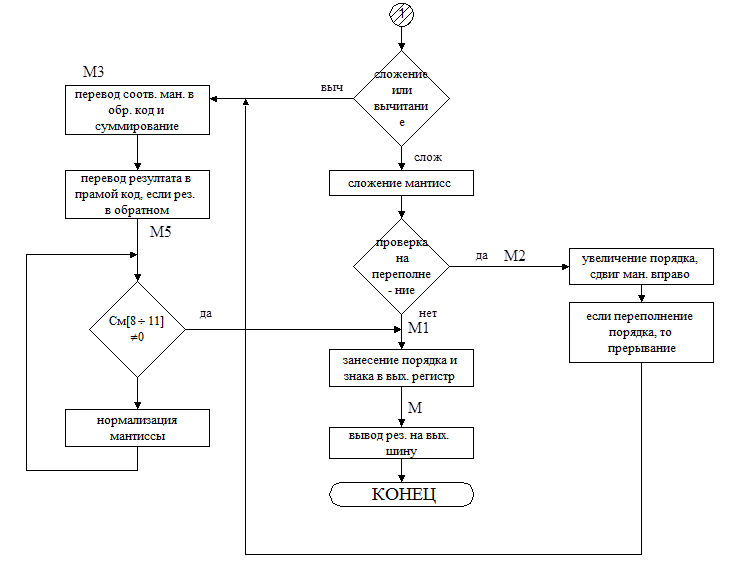 После выравнивания порядков модули мантисс хранятся в Pгl и РгЗ в разрядах с 8-го по 31-й, их знаки в Тг3н2 и Тг3н1, а порядок результата в Сч1. Сложение мантисс. Анализируются знаки мантисс и при равенстве знаков модули мантисс складываются. Если оказывается, что См [7] = 1, то возникло переполнение при сложении мантисс. В случае переполнения мантисса суммы сдвигается на четыре двоичных разряда (один шестнадцатеричный разряд) вправо, а порядок увеличивается на 1 (Сч1: = Сч1 + 1). Если после этого Сч1 [0] = 1, то формируется признак прерывания из-за переполнения порядка. Если переполнения нет, то в РгСм формируется результат операции, для чего содержимое Сч1 [1 ¸ 7] заносится в РгСм [1 ¸ 7], в РгСм [0] передается знак, а в РгСм [8 ¸ 31]— мантисса суммы. При различных знаках мантисс отрицательная мантисса передается на входной регистр сумматора в обратном коде и производится суммирование ее с прямым кодом положительной мантиссы и 1, прибавляемой к младшему разряду сумматора. Знак результата фиксируется в триггере знака. От полученного результата, если он отрицателен, берется его модуль. Если результат нормализован (См [8 ¸ 11] ¹ 0), то на РгСм заносятся знак результата (по значению триггера знака), порядок по значению Сч1 и модуль мантиссы. Если результат не нормализован и нет исчезновения значимости (мантисса не равна 0), производится нормализация. Мантисса результата сдвигается влево и одновременно уменьшается порядок результата (Сч1: = Сч1 - 1). При отрицательном переполнении порядка (Сч1 [0] = 1) формируется признак исчезновения порядка. Если нормализация завершается без исчезновения порядка, формируется результат операции из кода знака, порядка и мантиссы. Микропрограмма процедуры сложения мантисс: