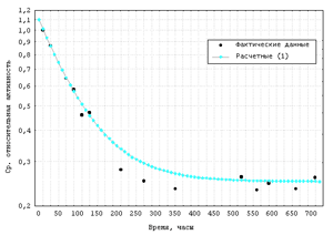 После того, как были определены все неизвестные величины в уравнении 1, Act Y была рассчитана теоретически для произвольного момента времени t. На рис. 2 приведено среднее значение, нормированных объемных активностей на момент первого измерения (примерно 10 часов после отбора). О высокой адекватность теоретических данных фактическим результатам свидетельствуют высокие значения корреляционных отношений между ними