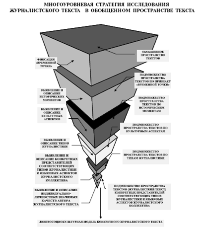 –выявление и описание конкретных представителей соответствующего типа журналистики; –выявление и описание языковых аспектов журналистского коллектива конкретных представителей соответствующего типа журналистики; –выявление и описание индивидуальноличностных значимых качеств (например, уро вень образования, литературный стиль, тип психики и т. п.) конкретного автора соответствующего журналистского текста. Практическая реализация разработанной методологии возможна только на основе некоей структурной упорядоченности, алгоритма применения совокупности используемых методов и способов. Тексты других жанров, особенно устные, требуют иного подхода и, следовательно, модифицированной методологии. Целью лингвосоциокультурного моделирования является установление общего в текстах, выявление определенных тенденций, получение “скелета” с “узловыми точками” для социокультурных моделей журналистики и, тем самым, их представление в виде лингвосоциокультурных переменных. Структура лингвосоциокультурного моделирования журналистского текста следующая: – Раскрытие “пространства коммуникации” и “пространства исторического времени” – своеобразное философское развитие предложенного Е. А. Корниловым понятия “исторический тип” издания применительно к журналистскому тексту. Шаг 1. Фиксация “временной точки” – определение конкретного исторического времени анализа издания, например 2002 год XXI века. Шаг 2. Выявление и описание исторических моментов – тип общественно-экономической формации и основные исторические моменты (например, войны, землетрясения, засуха, наводнение и т. п.), имеющие место в данный момент конкретного исторического времени. – Раскрытие “пространства коммуникации” и “пространства культуры” – совокупность культурологического анализа языковой ситуации в конкретном социальном пространстве и социолингвистического изучения языка журналистских текстов. Шаг 1. Уточнение уровня этнического, социальноэкономического и политического развития общества. Шаг 2. Уточнение уровня культурного развития общества, например на основе длительности литературных традиций. Шаг 3. Уточнение численности, компактности проживания носителей языка и их этнического окружения. Шаг 4. Выявление лингвокультурем – “узловых точек”, являющихся базовыми для текстов/ дискурсов. Шаг 5. Учет смысловой погрешности, возникающей при переходе лингвокультурем из одного текста/дискурса в другой. Шаг 6. Фиксация социальной вариативности языковых средств журналистских текстов на основе выявления социолингвистической переменной – языкового коррелята стратифицированной или ситуационной вариативности, а именно: а) объем и семантическая структура заголовочных комплексов; б) укрупненная семантико-стилистическая структура наименований тематических полос, блоков, рубрик, заголовков; в) укрупненная речевая структура текста; г) укрупненные лексические особенности текста; д) укрупненные синтаксические особенности текста. – Раскрытие “пространства коммуникации” и “пространства типов журналистики” – своеобразная параметризация проблемной области различных социокультурных моделей журналистики. Шаг 1. Выявление фактора автора текста: журналист/непрофессиональный журналист; жизненный путь автора, публикации, принадлежно