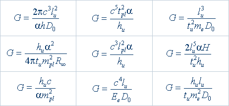 Из приведенных формул видно, что константа G выражается с помощью других фундаментальных констант очень компактными и красивыми соотношениями. При этом, все формулы для гравитационной константы сохраняют когерентность. В числе физических постоянных, с помощью которых представлена гравитационная константа, находятся такие константы как фундаментальный квант hu , скорость света c, постоянная тонкой структуры α, постоянная Планка h, число π, фундаментальная метрика пространства-времени (lu , tu ), элементарная масса me , элементарный заряд e, большое число Дирака D0 , энергия покоя электрона Ee , планковские единицы длины lpl , массы mpl , времени tpl , постоянная Хаббла H, константа Ридберга R∞ . Это указывает на единую сущность электромагнетизма и гравитации и на наличие фундаментального единства у всех физических констант. Из приведенных формул видно, что связь между электромагнетизмом и гравитацией действительно существует и проявляется даже на уровне гравитационной константы G. Теперь, по прошествии 200 лет после первого измерения G, появилась возможность на основе полученных формул вычислить ее точное значение, используя константы электромагнетизма. Поскольку точность в определении констант электромагнетизма высокая, то точность гравитационной постоянной можно приблизить к точности электромагнитных констант. Все приведенные выше формулы дают новое значение G, которое по точности почти на пять порядков (!) выше известного на сегодня значения. Новое значение G вместо четырех цифр содержит 9 цифр [6, 9, 10, 15]: G = 6,67286742(94)·10–11 м3 кг–1 с–2 . С помощью универсальных суперконстант удалось получить новые формулы для планковских констант [6, 8, 9, 15]: