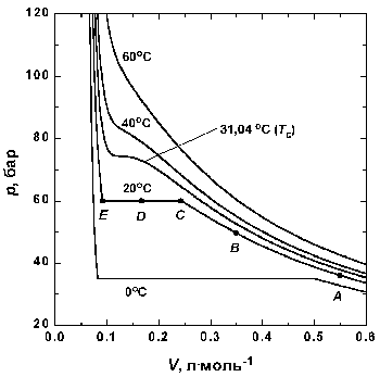 Рис 1.3. Экспериментальные изотермы для СО2 Вблизи точки А давление возрастает приблизительно по закону Бойля. Заметные отклонения от закона Бойля начинают наблюдаться, когда объем становится соизмеримым со значением, указанным точкой В. В точке С сходство с идеальным поведением полностью теряется, так как оказывается, что дальнейшее уменьшение объема не вызывает роста давления; это показано горизонтальной линией CDE. Исследование содержания сосуда показывает, что сразу за точкой С появляется жидкость, и можно наблюдать две фазы, разделенные резко обозначенной границей – поверхностью раздела. Поскольку при уменьшении объема газ конденсируется, он не оказывает сопротивления дальнейшему движению поршня. Давление, соответствующее линии CDE, когда жидкость и пар находятся в равновесии, называется давлением пара жидкости при температуре опыта. В точке Е весь образец представляет собой жидкость, и дальнейшее уменьшение объема образца требует значительного давления, поскольку жидкости по сравнению с газами очень трудно сжимаются, что проявляется в резком подъеме кривой слева от точки Е. Критические явления. Изотерма при температуре Tк играет особую роль в теории состояния вещества. Изотерма, соответствующая температуре ниже Tc, ведет себя так, как уже описано: при определенном давлении газ конденсируется в жидкость, которую можно различать по наличию поверхности раздела. Если же сжатие осуществлять при Tc, то поверхность, разделяющая две фазы, не появляется, а точка конденсации и точка полного перехода в жидкость сливаются в одну критическую точку газа. При температуре выше Tc газ невозможно обратить в жидкость никаким сжатием. Температура, давление и мольный объем в критической точке называются критической температурой Tc, критическим давлением pc и критическим мольным объемом Vc вещества. Собирательно параметры pк, Vк, и Tк называются критическими константами данного газа. При T > Tк образец представляет собой фазу, полностью занимающую объем содержащего ее сосуда, т. е. по определению является газом. Однако плотность этой фазы может быть значительно большей, чем это типично для газов, поэтому обычно предпочитают название "сверхкритический флюид" (supercritical fluid). В критической точке изотермический коэффициент сжимаемости