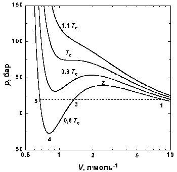 Рис.1.4 Изотермы Ван-дер-Ваальса для СО2 На рис. 1.4 приведены изотермы, вычисленные по уравнению Ван-дер-Ваальса для диоксида углерода. Из рисунка видно, что при температурах ниже критической (31,04 °С) вместо горизонтальных прямых, соответствующих равновесию жидкости и пара, получаются волнообразные кривые 12345 с тремя действительными корнями, из которых только два, 1 и 5, физически осуществимы. Третий корень (точка 3) физически не реален, поскольку находится на участке кривой 234, противоречащем условию стабильности термодинамической системы. Состояния на участках 12 и 54, которые соответствуют переохлажденному пару и перегретой жидкости, соответственно, являются неустойчивыми (метастабильными) и могут быть лишь частично реализуемы в специальных условиях. Так, осторожно сжимая пар выше точки 1 (рис. 1.4), можно подняться по кривой 12. Для этого необходимо отсутствие в паре центров конденсации, и в первую очередь пыли. В этом случае пар оказывается в пересыщенном, т.е. переохлажденном состоянии. И наоборот, образованию капелек жидкости в таком паре способствуют, например, попадающие в него ионы. Это свойство пересыщенного пара используется в известной камере Вильсона (1912), применяемой для регистрации заряженных частиц. Движущаяся заряженная частица, попадая в камеру, содержащую пересыщенный пар, и соударяясь с молекулами, образует на своем пути ионы, создающие туманный след – трек, который фиксируется фотографически. Согласно правилу Максвелла (the Maxwell construction), которое имеет теоретическое обоснование, для того, чтобы расчетная кривая соответствовала экспериментальной равновесной изотерме, нужно вместо кривой 12345 провести горизонтальную прямую 15 так, чтобы площади 1231 и 3453 были равны. Тогда ордината прямой 15 будет равна давлению насыщенного пара, а абсциссы точек 1 и 5 – мольным объемам пара и жидкости при данной температуре. По мере повышения температуры все три корня сближаются, и при критической температуре Tc все три корня становятся равными. В критической точке изотерма Ван-дер-Ваальса имеет точку перегиба Совместное решение этих уравнений дает вывод критических параметров. Соответственно, согласно уравнению Ван-дер-Ваальса, критический фактор сжимаемости Z для всех газов должен быть равен: