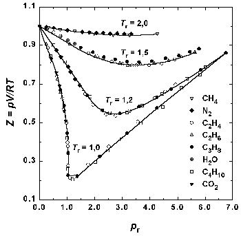 Рис.1.6. Зависимость фактора сжимаемости некоторых газов от приведенного давления при разных приведенных температурах. Можно показать, что любое уравнение состояния, содержащее три параметра, можно представить в приведенной форме. Для тех из них, которые содержат три параметра, представлена также и приведенная форма. Отсутствие универсального уравнения F(pr, Vr, Tr) = 0 говорит не о неверности закона о соответственных состояниях, а о недостаточности двух индивидуальных постоянных и R в уравнении состояния. В настоящее время понятно, почему в уравнениях состояния реальных газов двух индивидуальных параметров в общем случае не хватает, но в первом приближении этого достаточно. Причиной всех отклонений от уравнения состояния идеального газа являются межмолекулярные взаимодействия в газах. Статистический расчет показывает, что наличие индивидуальных постоянных в уравнении межмолекулярного взаимодействия всегда приводит к появлению индивидуальных постоянных и в уравнении состояния газов. Поэтому в области значений p, V и T, для которых в реальных газах вклад межмолекулярных взаимодействий достаточно велик, в уравнениях состояния появляются индивидуальные постоянные, зависящие от параметров уравнении межмолекулярного взаимодействия. Поэтому в приближенных уравнениях состояния часто оказывается достаточно использовать две индивидуальные постоянные. Если же требуется описать поведение газа с более высокой точностью, необходимо использовать уравнения с бу льшим числом постоянных. Так, например, уравнение Битти – Бриджмена содержит пять постоянных кроме R и считается одним из лучших эмпирических уравнений состояния. В течение некоторого времени оно применялось при составлении справочных таблиц реальных газов. В настоящее время для возможно более точного описания свойств газов используют эмпирическое уравнение Бенедикта – Вебба – Рубина: