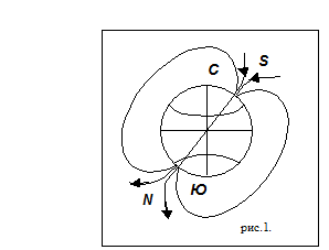 В любой точке пространства, окружающего Землю, и на её поверхности обнаруживается действие магнитных сил. Иными словами, в пространстве, окружающем Землю, создаётся магнитное поле, силовые линии которого изображены на рис.1.