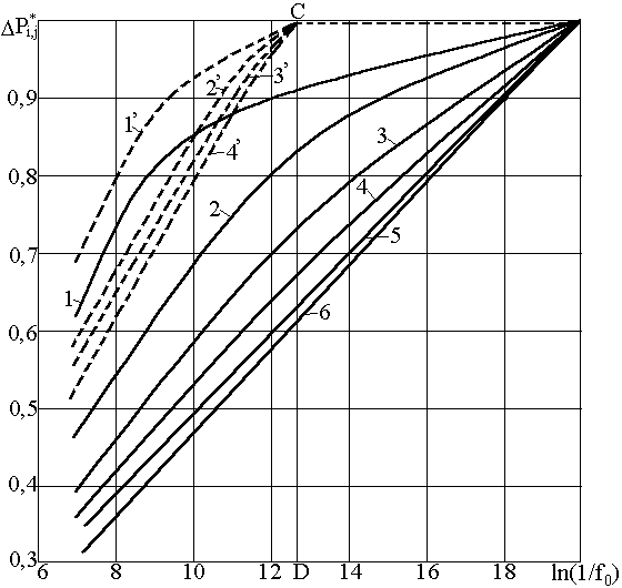 Анализ поведения R* i,j (rc ) и результаты обработки расчетного материала, где установлена ее зависимость от параметров rc , h, f0 , частично приведены на рис, 2 (кривые даны пунктиром). При гc >0,01 для любого hi R* i,j (rc ) уже не зависит от f0i . Из анализа данных расчета и графиков рис. 2 следует: при rc <0,01 в поведении R* i,j (rc ) для всех h<l,0 наблюдается нелинейный участок, переходящий с некоторого значения f0 (точка С на графике) в прямую линию, параллельную оси абсцисс. Важно отметить, что для одного и того же значения rc абсцисса точки перехода нелинейного участка в линейный для R* i,j (rc ) имеет то же самое значение, что и абсцисса точек перехода для графиков зависимостиDp* i,j (rc ) от ln(l/f0i ) (линия CD). Начиная с этого момента, R* i,j (rc ) для данного rc при дальнейшем наблюдении зависит не от времени, а только от hi • И чем выше степень вскрытия, т. е. чем совершеннее скважина,. тем меньше будет значение R* i,j (rc ) И при h=l (скважина совершенная по степени вскрытия) функция сопротивления равна нулю. Очевидно, нелинейностьDp* i,j (rc ) связана с характером поведения функции сопротивления, которая, в свою очередь, зависит от параметра Фурье. Отметим также, что в точке С (рис. 2) численное значение функции сопротивления становится равным значению фильтрационных сопротивлений (C1 (rc , h)) для притока установившегося режима.