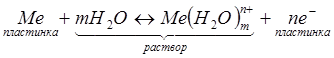 Для всех металлов характерно свойство в большей или меньшей степени растворяться в воде. При этом в воду переходят положительно заряженные ионы металла, в результате чего пластинка (из-за появления в ней избыточных электронов) заряжается отрицательно. Гидратированные катионы металла скапливаются возле поверхности пластинки на границе раздела двух фаз (металл-раствор). Возникает двойной электрический слой, характеризующийся некоторой разностью электростатических потенциалов. Как известно, энергию, которую необходимо затратить (положительный потенциал) или которую можно получить (отрицательный потенциал) при переносе единицы электричества из бесконечности в данную точку, называют электрическим потенциалом. Между пластинкой и раствором устанавливается окислительно-восстановительное равновесие: