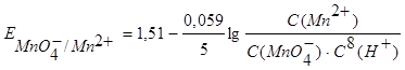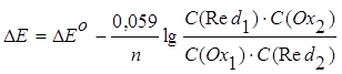 При подстановке численных значений R = 8,314 Дж/(моль×К), F=96494 Кл и Т (298 К) и замене натуральных логарифмов на десятичные уравнение упрощается:
