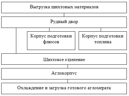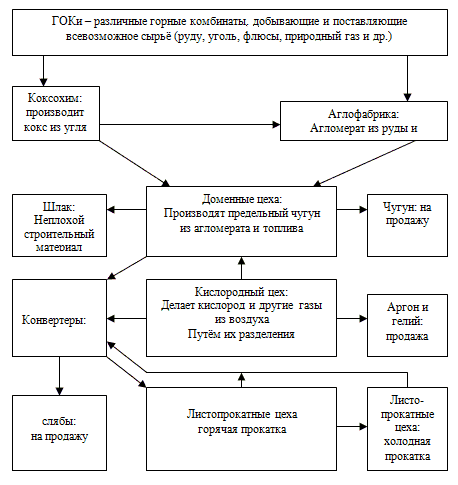 Схема производства агломерата на аглофабрике НЛМК Электросталеплавильный цех. На территории цеха расположено несколько зданий (установка непрерывной разливки стали, отдел зачистки слябов, подготовки и ремонта ковшей и т.д. ). Основное здание разделено на несколько пролётов: шихтовый, сюда поступают исходные материалы - компоненты шихты. печной, на тележках шихта поступает сюда из шихтового пролёта. Здесь установлены 2 дуговые сталеплавильные печи. Плавка длится 4,5 - 5 часов. разливочный пролёт, из печного пролёта металл сливается сюда. Металл сливается в ковши, после он ставится на стенд и продувается аргоном, который захватывает все частицы и газы. После ковш подают на устройство непрерывной разливки стали. Разливка происходит 1,5 часа. Есть устройство вертикального типа. Слиток формируется в кристаллизаторе, затем он попадает на тянущую клеть и проходит охладительную зону (большой расход воды ). После сляб подаётся на нулевую отметку с помощью тросов, где его режут. Содержание кремния в металле до 3%. После резки сляб подаётся в термические печи, где металл находится около 5 часов и нагревается до 8000С (2 часа), нормализуется , а после остывает. При температуре 1000С металл выпускают из печи и закрывают специальными колпаками. Затем его подают на участки зачистки слябов. Проверяют слитки на брак, устраняют дефекты и подают в листопрокатный цех. Основной продукт - трансформаторная сталь. Кислородно - конвертерный цех. Цех производит 5 млн. стали в год. Основные подразделения : Миксерное отделение. Миксер - накопитель жидкого чугуна , в котором происходит усреднение его по химическому составу и температуре. Это очень ёмкий процесс, требующий больших затрат. Конвертерное отделение. Загрузка конвертера состоит на 30% из стального лома и на 70% из жидкого чугуна. Это называется садка, то, что заваливают в конвертер (250 тонн чугун и 100 тонн лом). Лом привозят со всего комбината, а чугун из доменного цеха. Лом бывает 2 - х видов: легковесный (брикеты стружки) и тяжеловесный (станины от станков и т.д. ). Процесс состоит из нескольких стадий : завалка лома, присадка конвертера (засыпка извести), заливка чугуна (3 - 5 мин.), продувка кислородом (20 мин.) через фурмы, конвертер наклоняется для забора проб, чтобы сделать анализ. металл сливают в сталеразливочный ковш и добавляют ферросплавы, сталевоз увозит сталь, а шлак подаётся в шлаковню. От слива до слива проходит 43 минуты. Отделение непрерывной разливки стали. Скорость разливки от 0,6 до 1 метра металла в минуту. Время разлива 1 час 10 минут - 1 час 30 минут. Отделение устранения дефектов слитка. Здесь собирают слябы, раскладывают и охлаждают, а после каждый сляб проверяют, зачищают дефекты кислородными резаками и отправляют на склад. Шлаковое отделение. Это большая яма, в которую сливают шлак, охлаждают его и затем перерабатывают. Общее число плавок в сутки достигает 50. Кислородно - конвертерный цех Миксерное отделение. Жидкий чугун с доменной печи поступает в отделение. Есть 2 миксера из них чугун переливают в ковш и подают на конвертерную площадку. Исходные материалы: металлический лом - 50 т., чугун - 110 т. на плавку. В настоящее время производительность цеха составляет 1,5 млн. т. в год. Из 6 установок непрерывной разливки стали работают 3 вертикального типа и 2 криволинейного типа. Толщина сляба с вертикальной установки