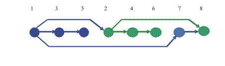 Рис.2 Здесь на нулевом уровне располагаются элементы, не требующие предварительных знаний (аксиомы, определения), на первом – элементы, основывающиеся на знаниях элементов нулевого уровня, на втором – элементы, требующие знаний элементов нулевого и первого уровня и т.д. Разными цветами представлены элементы разного рода (например, элементы, описывающие чисто электрические явления, синим цветом, и элементы, описывающие магнитные явления, зеленым цветом). В качестве первого элемента на нулевом уровне может быть определение заряда и его свойства, как аксиома. На первом уровне располагаются три элемента: это могут быть – 2 – определение электрического тока, 3 - закон взаимодействия зарядов (Кулона), 7 – плотность заряда; на втором уровне – также три элемента: 4 – закон взаимодействия линейных токов, 5 – определение напряженности электрического поля, 8 – плотность тока; на третьем уровне для данного фрагмента – 6 – определение магнитной индукции. Построение порядковой функции для больших разделов и фрагментов может быть выполнено с помощью специальной программы. При конкретном изложении учебного материала исходный граф представляют в виде той или иной цепочки. Для данного фрагмента графа последовательность изложения материала может быть следующая: