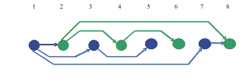Рис.3 Из рисунка видно, что элементы одного рода располагаются последовательно и изложение материала происходит как бы по разделам: элементы 1, 3, 5, если это физика электромагнетизма, относятся, например, к началам электростатики; элементы 2, 4, 6 относятся к началам магнитостатики; элементы 7 и 8 могут быть началом нового раздела, в котором при изложении используются элементы одного и другого рода (допустим, разделы постоянного и переменного токов). Фрагмент графа рис.2 допускает и другую последовательность изложения учебного материала.