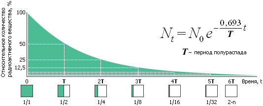 Рис. 1. Радиоактивный распад При радиоактивном распаде число нестабильных ядер уменьшается с течением времени очень быстро – экспоненциально. Продолжительность жизни распадающегося вещества характеризуют временем, по истечении которого количество активных атомов в веществе в среднем уменьшается вдвое. Этот промежуток времени Т называется периодом полураспада. Если, например, в материале, испытывающем радиоактивное превращение, первоначально было N0 ядер, то через время Т их станет 1/2 N0, через 2Т – 1/4 N0, через 3Т – уже 1/8 N0, и так далее. Число радиоактивных ядер будет «выгорать» в геометрической прогрессии с показателем, равным двойке. Периоды полураспада для различных радиоактивных веществ изменяются от миллиардов лет до миллионных долей секунды и хорошо поддаются вычислению с помощью квантовой механики. В принципе особой необходимости в специальной единице эквивалентной дозы нет, она может измеряться в тех же единицах, что и поглощенная доза, поскольку коэффициент Q – безразмерный. Тем не менее, учитывая важность проблемы биологического действия ионизирующих излучений, в радиационной физике и при расчете защиты от ядерных излучений стали использовать единицу эквивалентной дозы. В системе СИ эта единица установлена совсем недавно и называется зиверт (обозначается Зв, Sv). Эквивалентная доза в 4...5 зиверт (примерно 400...500 бэр), полученная за короткое время, вызывает тяжелое лучевое поражение и может привести к смертельному исходу. Предельно допустимая доза (ПДД) для персонала, работающего с радиоактивными веществами, установлена в 5 бэр/год (или примерно 100 мбэр/неделя). При этом имеется в виду облучение всего тела, как говорят, тотальное облучение. Для населения установлен предел дозы за год в десять раз меньший – 500 мбэр/год. Как же узнать, какую дозу радиации получает человек, находящийся вблизи радиоактивного источника? В том-то и состоит предательская особенность ядерных излучений, что с точки зрения человека, попадающего в опасную зону, они никак себя не проявляют. Человеческие органы чувств, сформировавшиеся как инструмент выживания, совершенно не приспособлены к восприятию проникающей радиации, и в этом ее существенное отличие, трагическая выделенность по сравнению с другими природными воздействиями. Ведь даже небольшие с точки зрения физики изменения светового потока, температуры воздуха или механического давления вызывают довольно бурную реакцию человеческого организма. По отношению к этим изменениям в окружающей среде природа с самого начала была поставлена в жесткие условия – жизнь обрывалась, если природные воздействия выходили за допустимые пределы. Острота восприятия помогает человеку ориентироваться в обстановке и принимать необходимые меры предосторожности. Скажем, зрение, которое на протяжении многих поколений служило почти единственным способом обнаружить врага, должно было действовать и в сумерках, и даже при свете звезд, когда световая энергия поступает лишь редкими порциями. Собрать и использовать каждый фотон, чтобы лучше увидеть надвигающуюся опасность, было делом жизни или смерти.