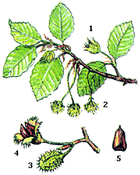 Ветка бука с женскими (1) и мужскими (2) соцветиями. Плоды с нераскрывшейся (3) и раскрытой (4) плюской, буковые орешки (5) Женские цветки закладываются на месяц позднее мужских, потому что для развития им нужен мороз. Обычно мужские цветки раскрываются на 3...4 дня раньше женских. Пыльца, образуемая в них, тяжелая, поэтому ветер, который и опыляет бук, относит ее лишь на небольшие расстояния. Любопытно отметить, что в ясную, солнечную погоду пылят цветки, выросшие в верхней части кроны, тогда как в дождливую – растущие в нижней половине. Когда, наконец, созреют и женские цветки, из них сильно высовываются наружу рыльца, покрытые липким секретом и готовые принять пыльцу. Внушительные размеры, колоннообразные стволы, диаметр которых достигает двух метров, мощные шатровидные густые кроны давно уже поразили воображение людей – бук стал воплощением и мерилом здоровья и силы. В сербской народной сказке «Медведович» медведь предлагает сыну испытать свою силу на буке: «Если вырвешь из земли этот бук – отпущу тебя странствовать по свету, а нет – придется тебе еще посидеть около меня». В Чехии молодого здорового парня нередко сравнивают с буком. Под густой сенью этих деревьев в чистых древостоях обычно нет растительности либо подлесок представлен тиссом, самшитом, боярышником... Листья бука – продолговато-эллиптические, зубчатые. Листовая поверхность одного дерева огромна: у столетнего бука высотой 25 метров она приблизительно равна 1200 квадратным метрам. Неудивительно, что бук значительно эффективнее очищает воздух от пыли и вредных газов, чем другие породы. За год гектар его насаждений задерживает 63 тонны пыли, тогда как дуб – 56, сосна – 36, ель – 32 тонны. Выведены декоративные формы бука – с шаровидной, пирамидальной и плакучей кроной, с бело-пестрыми, темно-пурпурными и рассеченными листьями. В имении И.С. Тургенева «Ясени» во Франции сохранился знаменитый плакучий бук, посаженный самим писателем перед виллой П. Виардо. В листьях бука много кальция, он любит этот химический элемент, и, если почва содержит достаточное количество кальция, ствол дерева вырастает более ровным и светлым. Стволы бука покрыты серой гладкой корой, сладкой на вкус. Об этой особенности издавна знали люди и, пользуясь ею, сочетали приятное с полезным. Так, в легендах индейцев Латинской Америки рассказывается о том, как, жуя кору, они получали много лыка и разделяли его на тонкие волокна, которыми стали сшивать куски коры в виде лодок. С тех пор индейцы, если верить легенде, так и строят свои лодки. Европейские мальчишки также осведомлены о сладости коры бука: они отделяют от ствола кусок коры и с аппетитом облизывают его внутреннюю сторону. Корневая система бука близко расположена к поверхности почвы, она не имеет ярко выраженного стержневого корня. Боковые корни уходят вертикально вниз, что характерно для так называемой якорной корневой системы. Поэтому на сыпучих почвах бук сильного ветра может не выдержать. Древесина бука белая с желтовато-красным оттенком и с красивым рисунком. Полежав какое-то время, приобретает розовато-коричневый цвет. Будучи твердой и плотной, она легко обрабатывается. В старину из нее делали ткацкие челноки. Еще древнегреческий философ, «отец ботаники» Феофраст писал в книге «Исследование о растениях», что «на горах растет белый бук, древеси