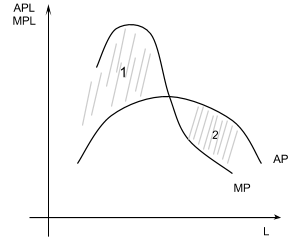 Первый участок характеризует превышение предельного продукта над средним. Он свидетельствует о том, что пока предельный продукт превышает средний, средний неизбежно возрастает. Когда предельный продукт равен среднему (точка пересечения), это является сигналом к тому, что эффективное расширение производства за счёт увеличения лишь одного переменного фактора дальше невозможно. На втором участке, когда предельный продукт меньше среднего, средний продукт будет неизбежно сокращаться.