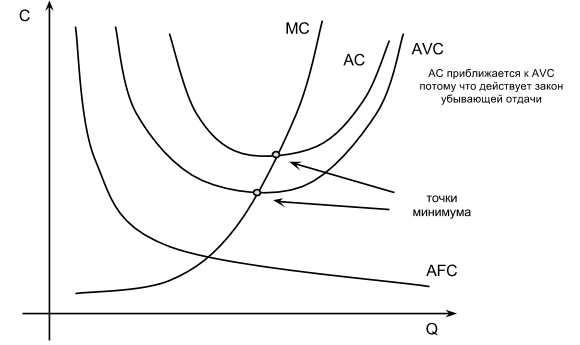 Долгосрочная кривая средних издержек LAC состоит из участков краткосрочных кривых средних издержек. При этом Q1, Q2, Q3, Q4 показывают те объёмы производства, при которых фирме следует изменить размер предприятия, чтобы обеспечить себе более низкие средние издержки.