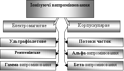 Іонізуючі випромінювання квантове (електромагнітне та корпускулярне) випромінювання, під впливом якого із нейтральних атомів утворюються іони.
