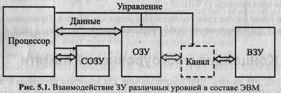 В основе большинства ЭВМ лежит трехуровневая организация памяти: сверхоперативная (СОЗУ) оперативная (ОЗУ) внешняя (ВЗУ). СОЗУ и ОЗУ могут непосредственно взаимодействовать с процессором, ВЗУ взаимодействует только с ОЗУ.