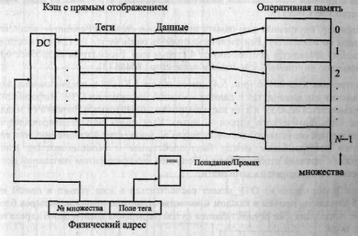 Кэш-память с прямым отображением требует минимальных затрат оборудования (по сравнению с другими вариантами организации кэш), но имеет минимальную вероятность кэш-попаданий. Суть организации (рис. 3) состоит в следующем. Физическая оперативная намять разбивается на блоки (множества) одинакового размера, количество которых (блоков) соответствует числу ячеек кэш, причем каждой строке ставится в соответствие определенное множество ячеек памяти, не пересекающееся с другими. Все ячейки множества претендуют на одну строку кэш.